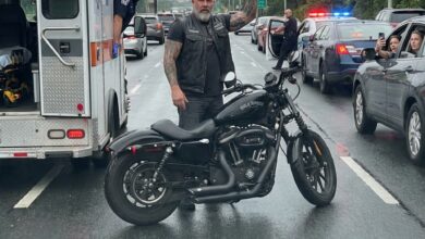The biker didn’t move his hand from the coffin.