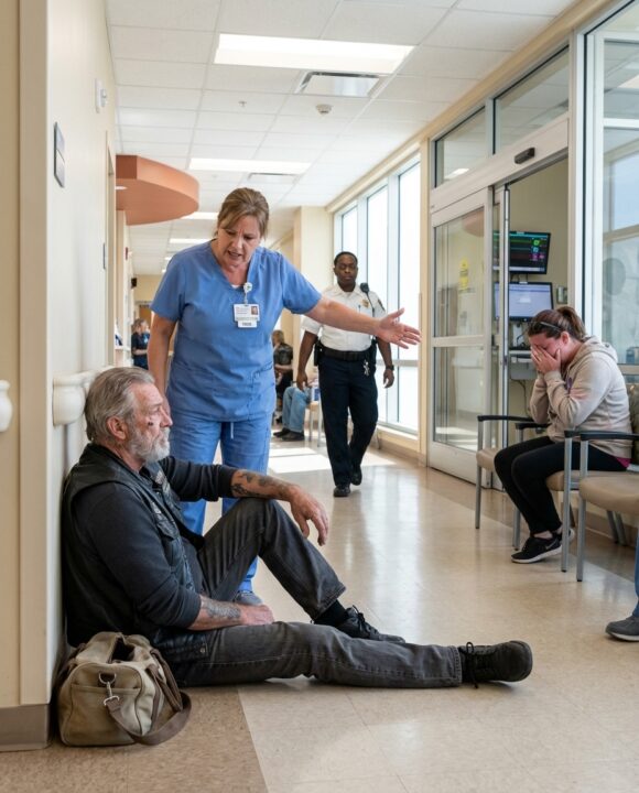 “Sir, you can’t sleep here.” The nurse’s voice trembled as a leather-clad man refused to move from the ICU corridor floor—machines beeping, a mother crying, security closing in… and no one knew who he was waiting for.