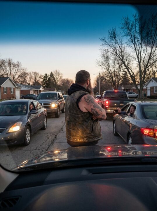 Another driver leaned out of his window, waving his arm aggressively while yelling something louder, angrier, as if volume alone could force the man to step aside.