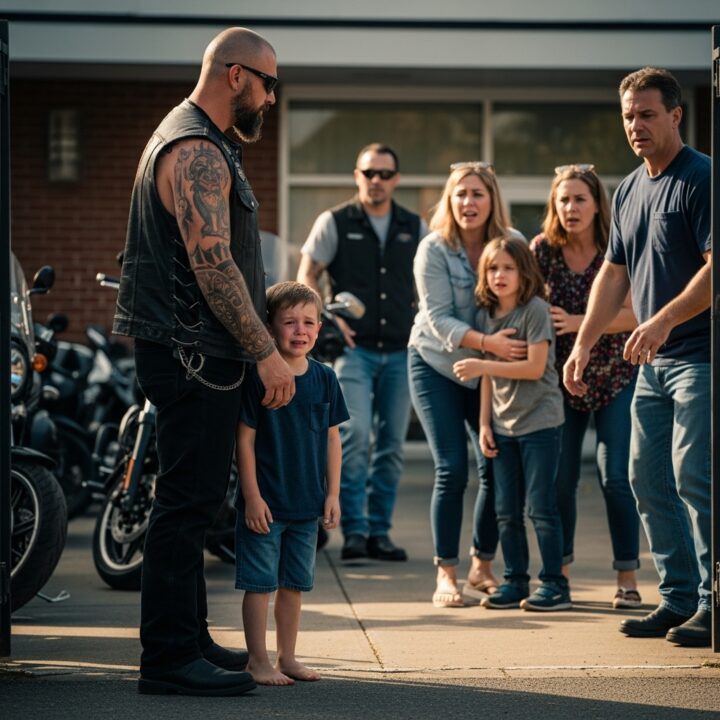 To everyone watching, it looked wrong. A biker kneeling in front of a crying child. Tattoos. Sunglasses. Silence.
