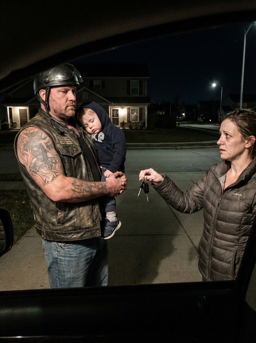 I handed my car keys to a rough-looking biker holding a trembling little girl outside my house because there were no taxis that night… and two hours later, someone knocked on my door and spoke my name like I had done something terribly wrong.