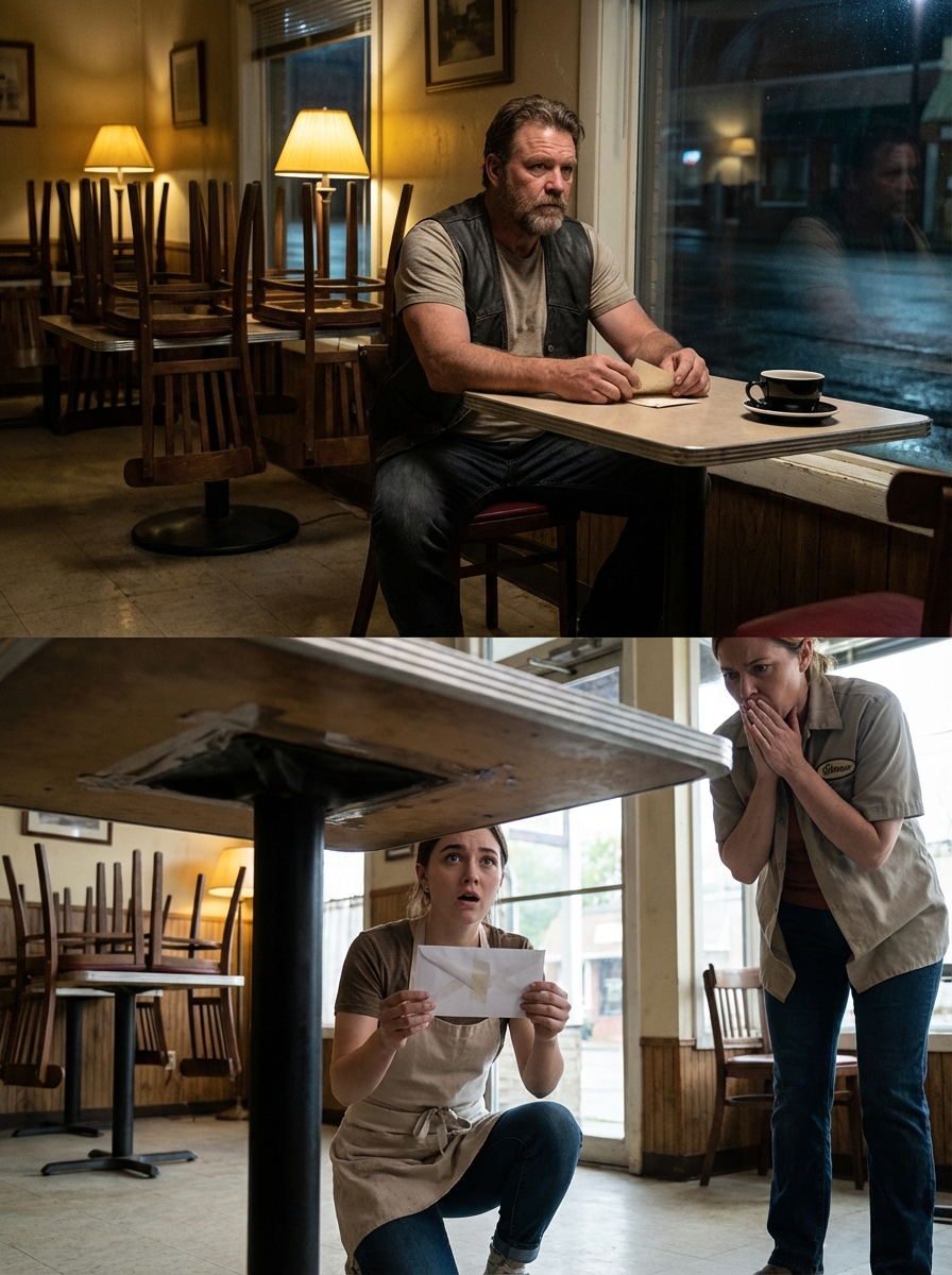 I let a biker sit alone in my café after closing with a single untouched cup of coffee on the table—and the next morning, my employee showed me something that made me sit down without saying a word.