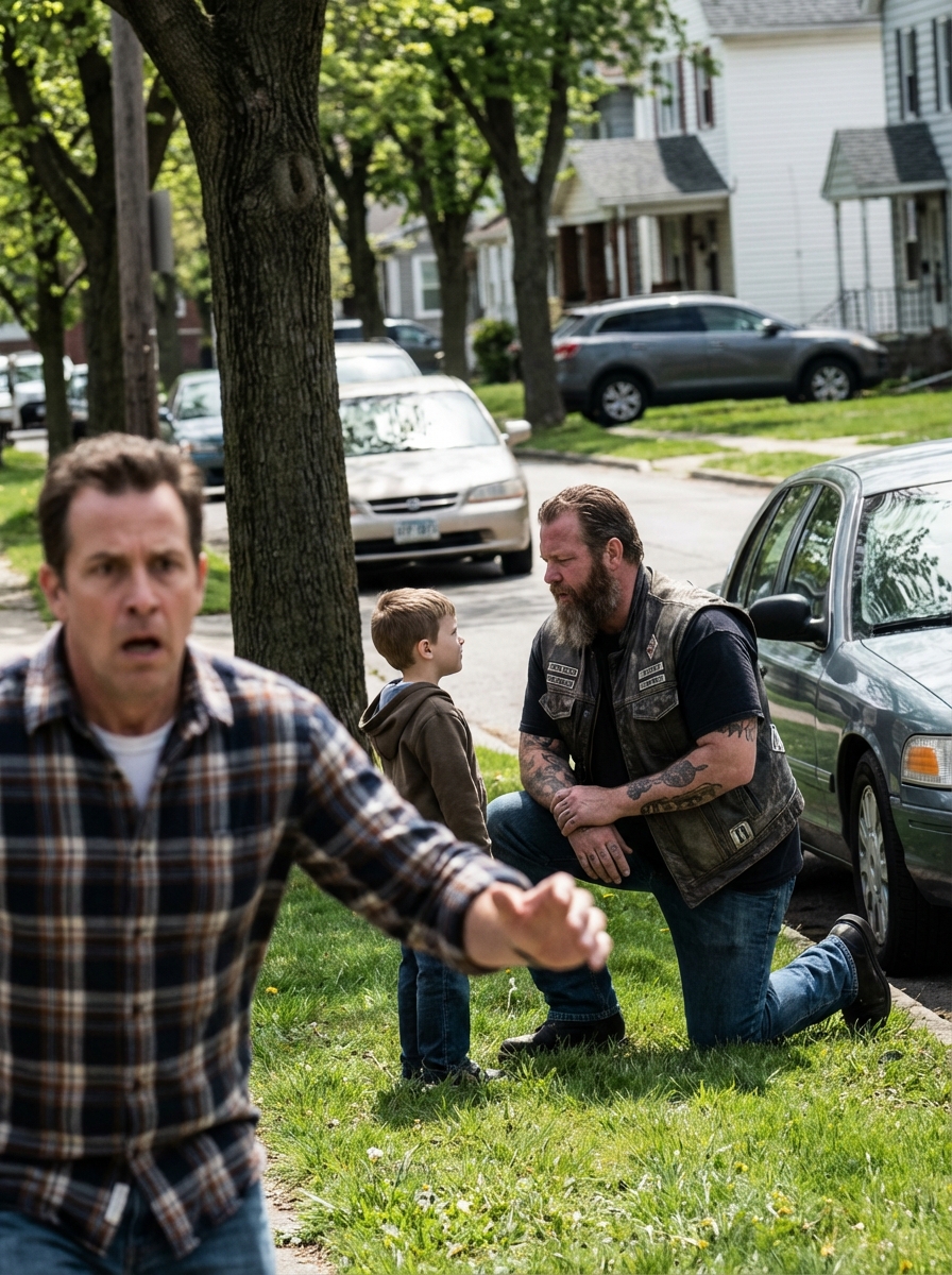 I was carrying two bags of groceries from the car to the front door when I looked across the street and saw a man in a leather vest kneeling on the sidewalk in front of my five-year-old son, their faces level, his tattooed hand resting on my boy’s shoulder — and I dropped everything and ran.