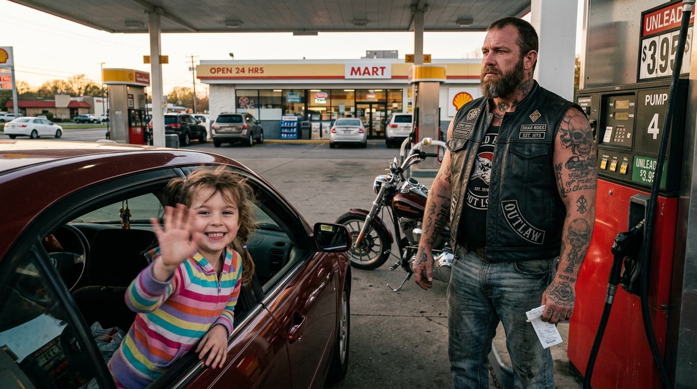 My granddaughter waved at a biker standing alone by a gas pump with a crumpled receipt in his hand—and the next day, the station owner asked me a question that made me stop mid-step.