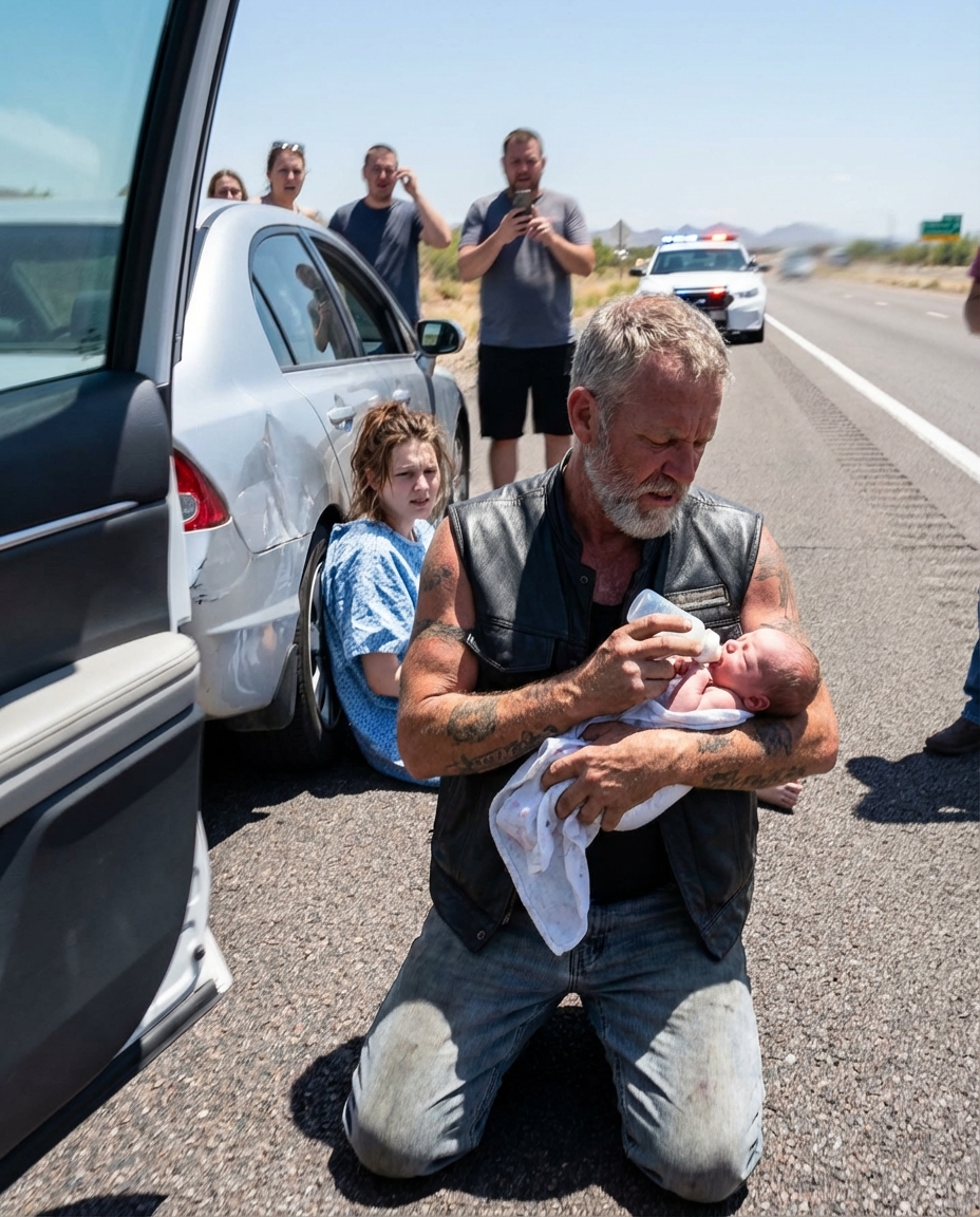 On a blazing July afternoon in Arizona, drivers slammed their brakes when they saw a tattooed biker holding a newborn to his chest on the shoulder of Interstate 17.