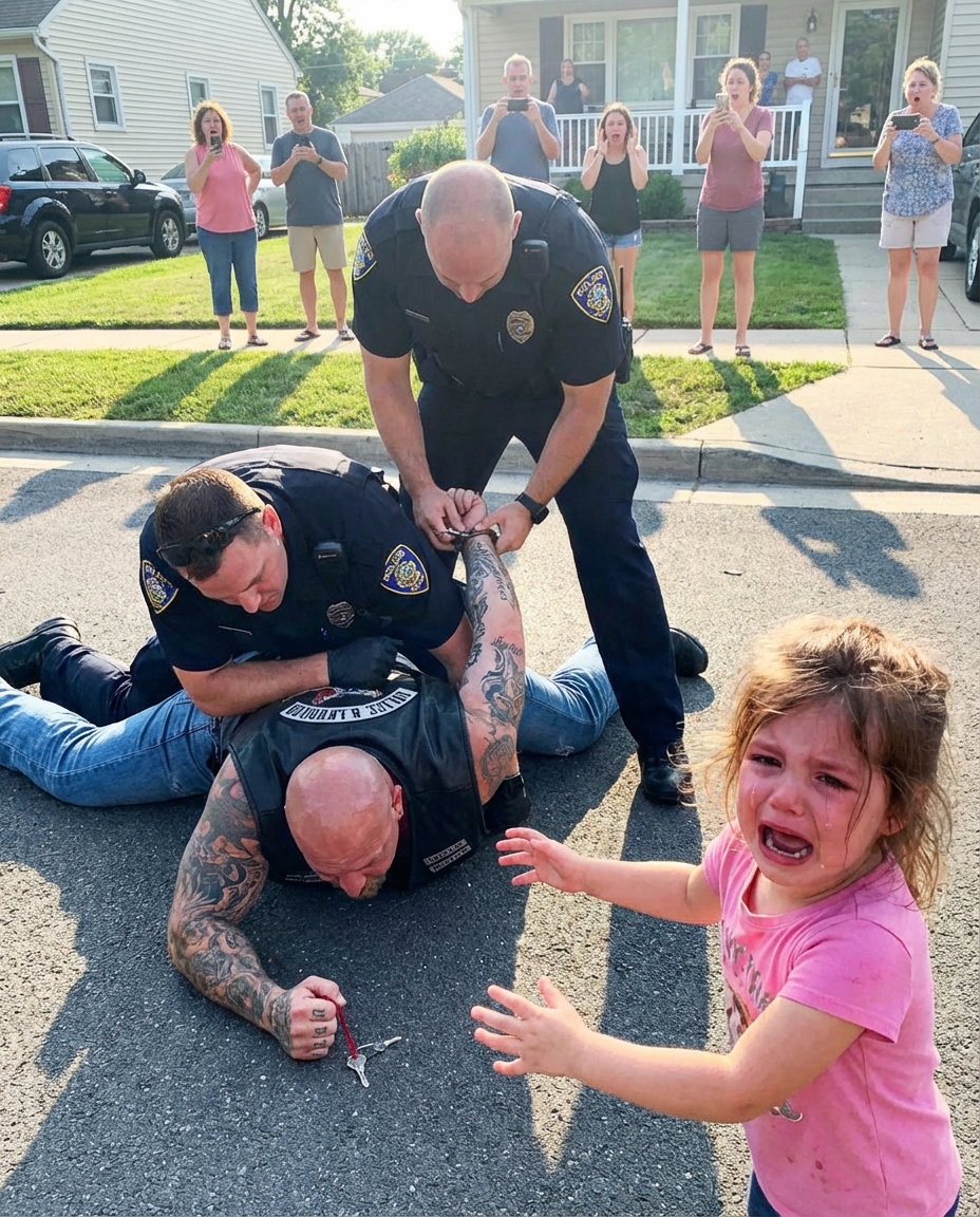 “They slammed the biker face-down onto the asphalt right in front of the crying little girl—but instead of begging them to stop, she screamed something that made even the officers hesitate—what did she know that no one else did?”