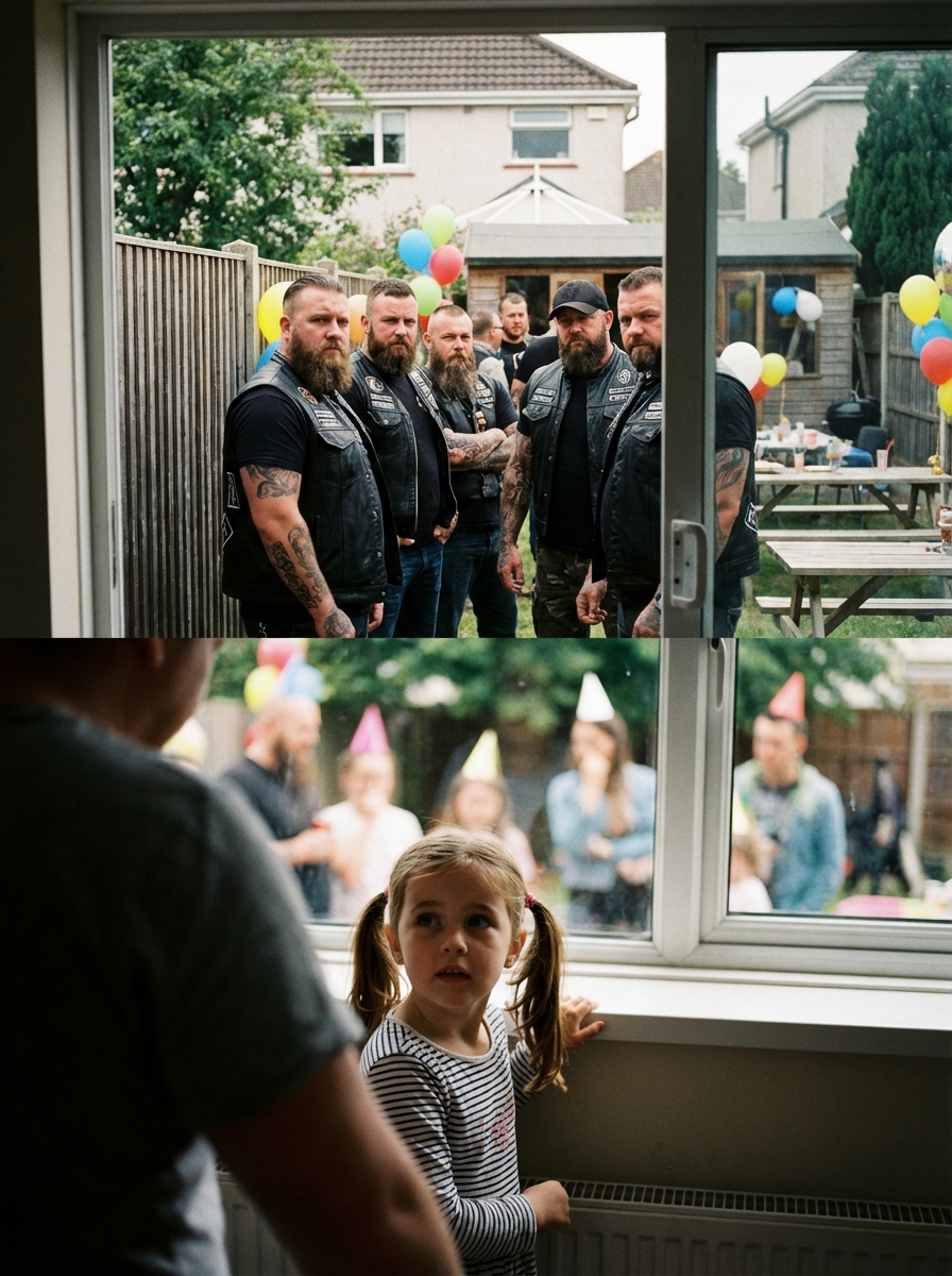 The party continued. Sort of. The music went back on. The kids went back to running. But there was a weight in the yard that hadn’t been there before — an invisible line that no one crossed, a corner of the property that everyone pretended wasn’t occupied by seven men in leather standing like statues by the fence.