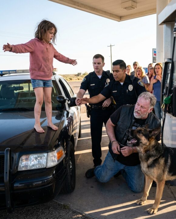 A small girl climbed onto the hood of a police car, arms stretched wide as if to shield a handcuffed biker, screaming that something was terribly wrong while officers moved to drag her away.