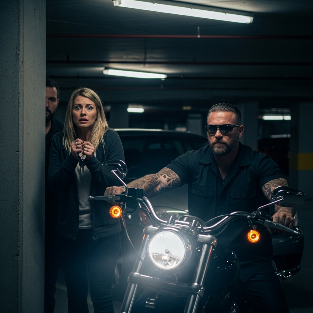 The biker swung his leg off the bike—not rushing, not charging—just placing himself squarely between the woman and the shadowed corner.