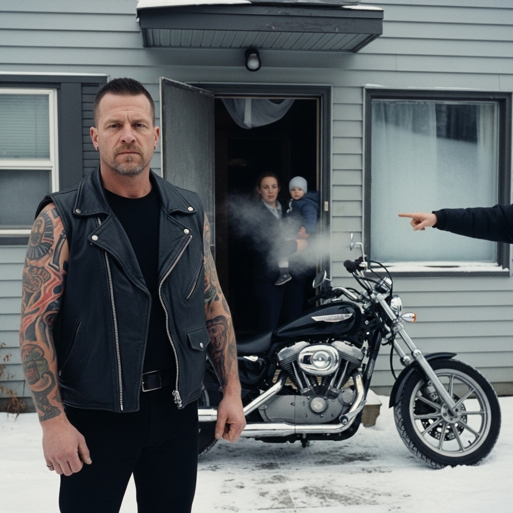 Red and blue lights washed over the house, the snow, the biker’s leather vest. The officer stepped out slowly, hand near his radio, eyes fixed on the motorcycle.