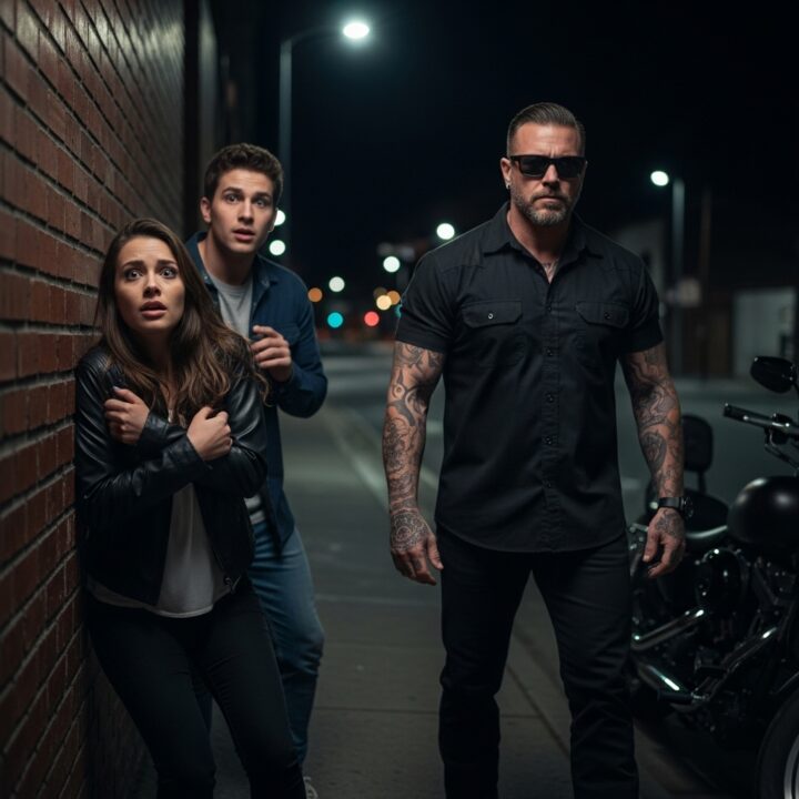 The biker didn’t shout. He didn’t threaten. He placed himself between the man and the woman as if it were the most natural thing in the world. His posture was calm, squared, unmistakably intentional.