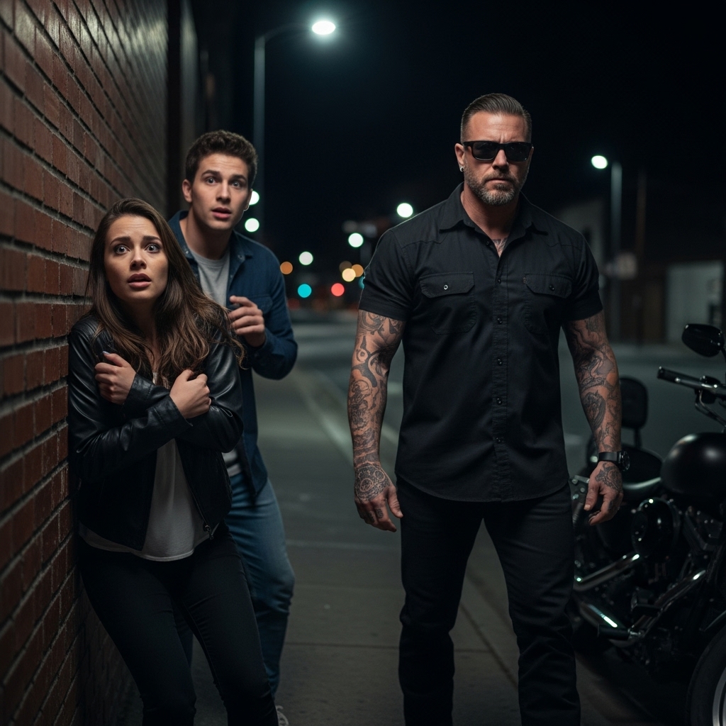 A couple down the block noticed and slowed. A bartender leaned out of a door. Eyes widened at the sight of a biker closing distance in a dark street. Tattoos traced the man’s forearms beneath a short-sleeve shirt. Sunglasses hid his eyes even at night. He looked, to anyone glancing quickly, like trouble that had finally arrived.