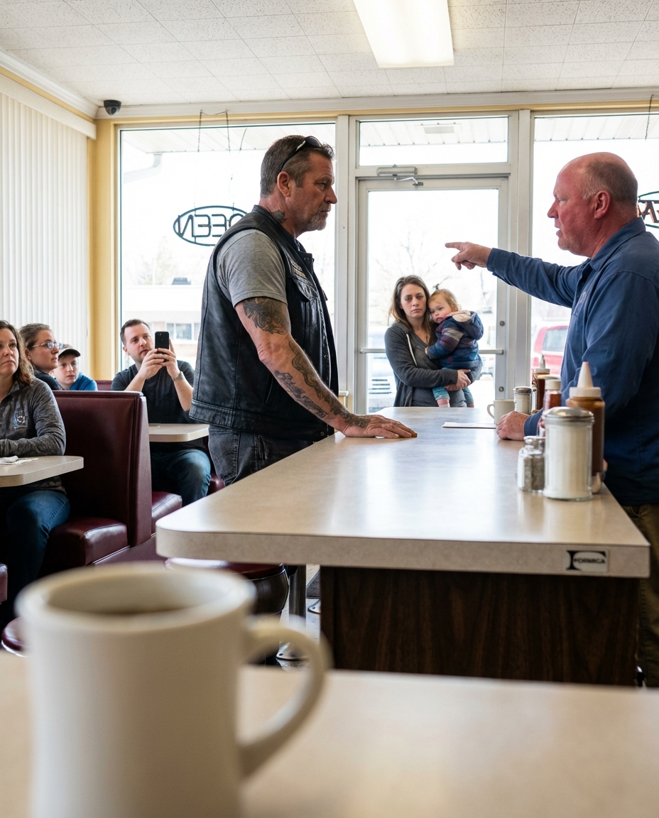The biker didn’t raise his voice. Didn’t clench his fists. But in a small-town diner, a tattooed man confronting the owner felt like gasoline near a spark.