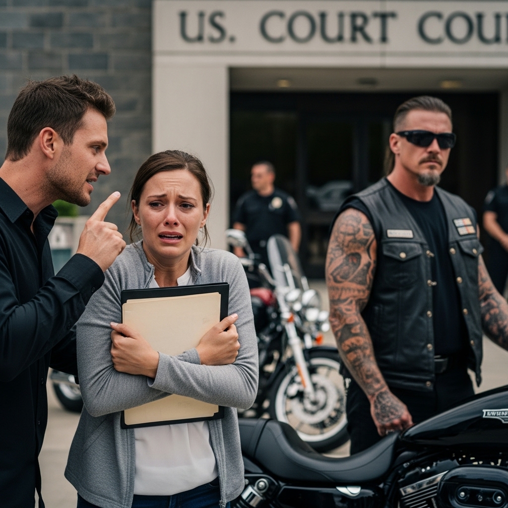 Then the murmurs shifted. A chair creaked behind the last row. A man rose slowly—leather vest, boots dulled by road dust, eyes steady. A biker stepped into the aisle, uninvited, unreadable. No one knew why he was there. No one knew what he would do.