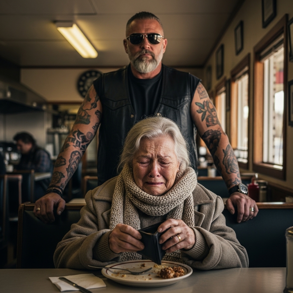 The biker didn’t respond. He walked past the counter, past the booths, straight toward the elderly woman.