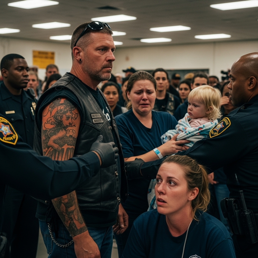 A man in a county emergency jacket rushed in first, scanning the room—until his eyes locked on the biker.