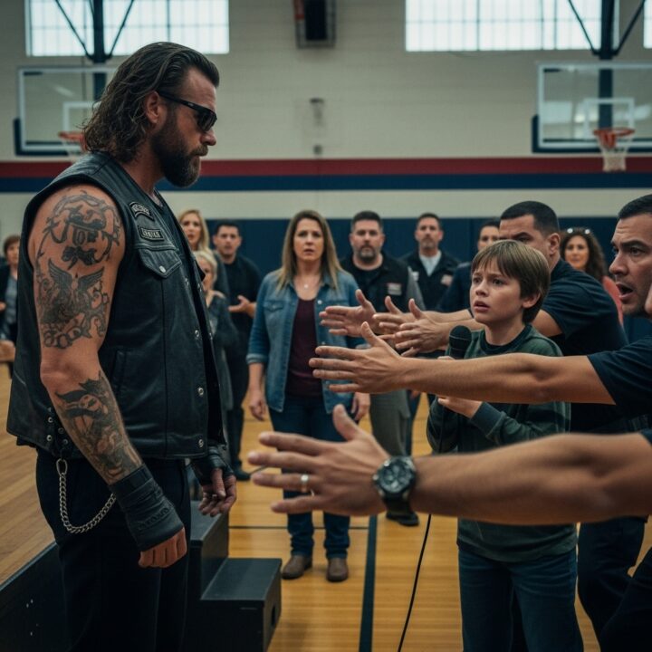 No one expected a leather-vested biker to be the most dangerous sight at a school assembly already spiraling toward panic and silence.