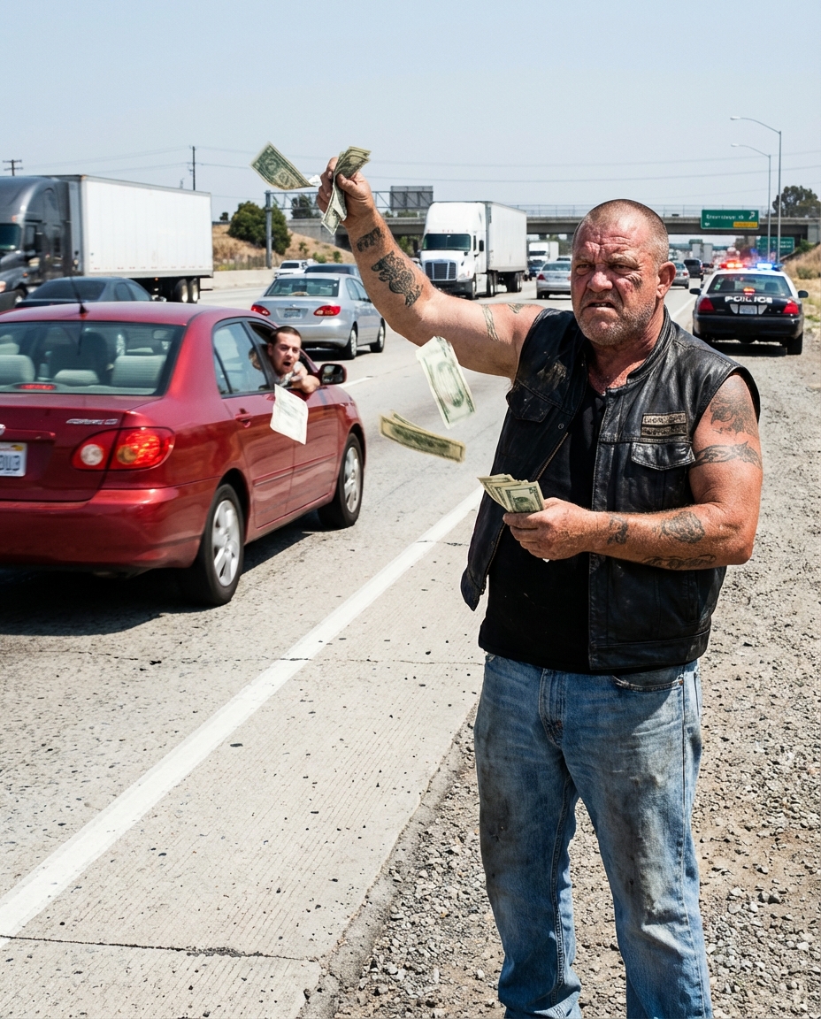 “A tattooed biker threw stacks of cash into speeding highway traffic—and instead of running, he stepped forward into the road like he was waiting for something worse to happen.”