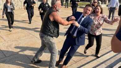 The biker reached over the counter—not fast, not violent—but enough to make the crowd gasp. The owner stumbled backward, shouting, “He’s threatening me!”