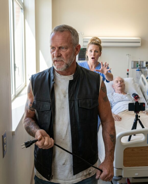Two hospital security officers burst into the ICU room, hands hovering near their belts. One of them reached for the biker’s shoulder.