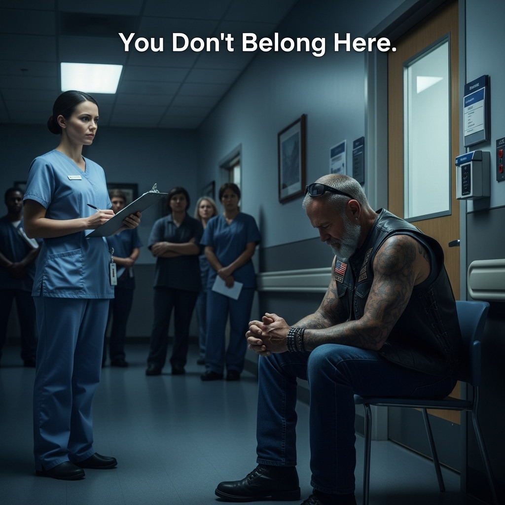 He sat in the hard plastic chair just outside the doors, his leather vest darkened by rain, boots still carrying the dust of the road. His hands rested on his knees. One of them trembled slightly. The other was still.