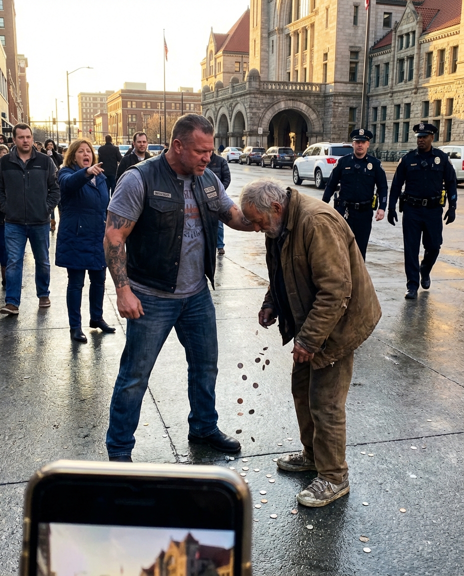 When the biker flung a handful of coins at the homeless man’s feet, the crowd thought they were witnessing cruelty in broad daylight.