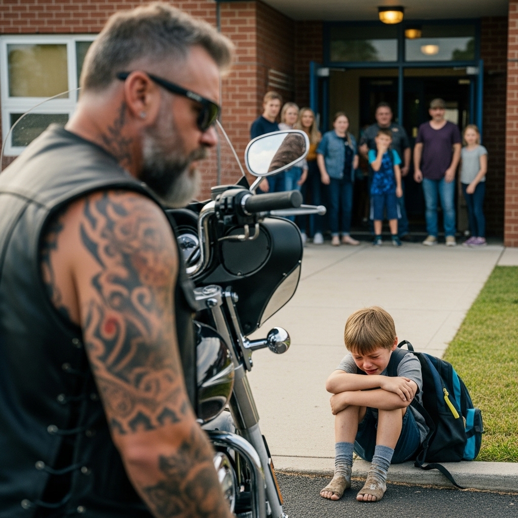 The Boy Crying Outside the School Without Shoes — Then a Biker’s Engine Stopped Behind Him