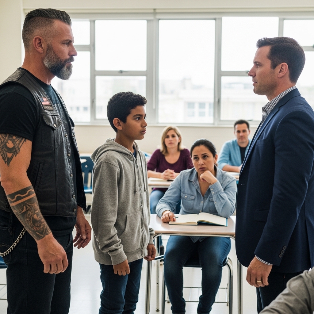 They laughed at the boy in the hallway—until the classroom door opened and a biker walked into the parent meeting.