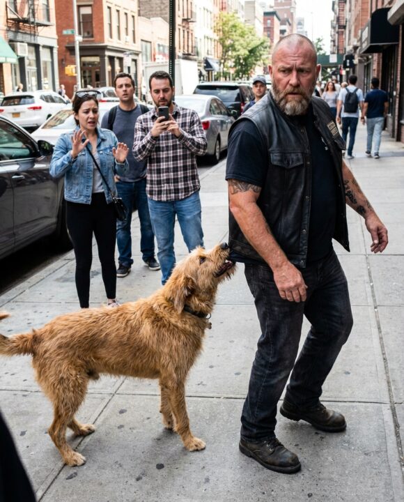 The stray dog suddenly lunged forward, clamped its jaws onto a biker’s leather jacket, and began dragging him away from the crowd as people shouted in panic—convinced they were watching an attack unfold.
