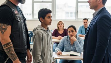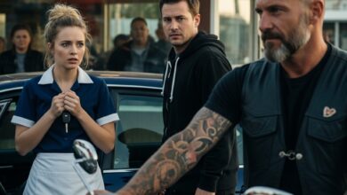 The biker’s arms were thick, inked with faded tattoos that told stories no one asked about. His jaw was set. His eyes hidden behind dark lenses.