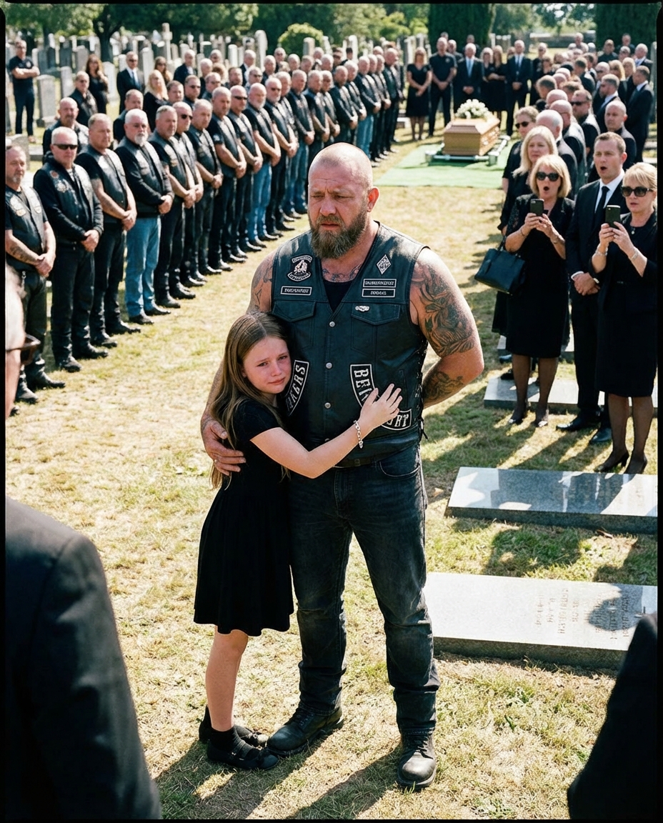 A small girl in a black dress clung tightly to a massive, tattooed biker in the middle of a silent cemetery, refusing to let go while dozens of hardened riders stood watching—and no one understood why.