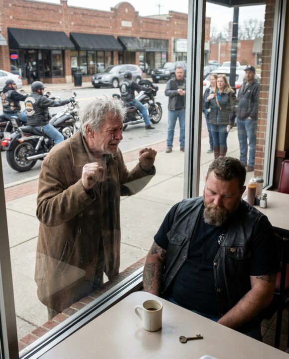 The old man kept slamming his trembling fists against the glass while inside, a massive biker sat completely still—unmoving, unblinking, like something was terribly wrong.