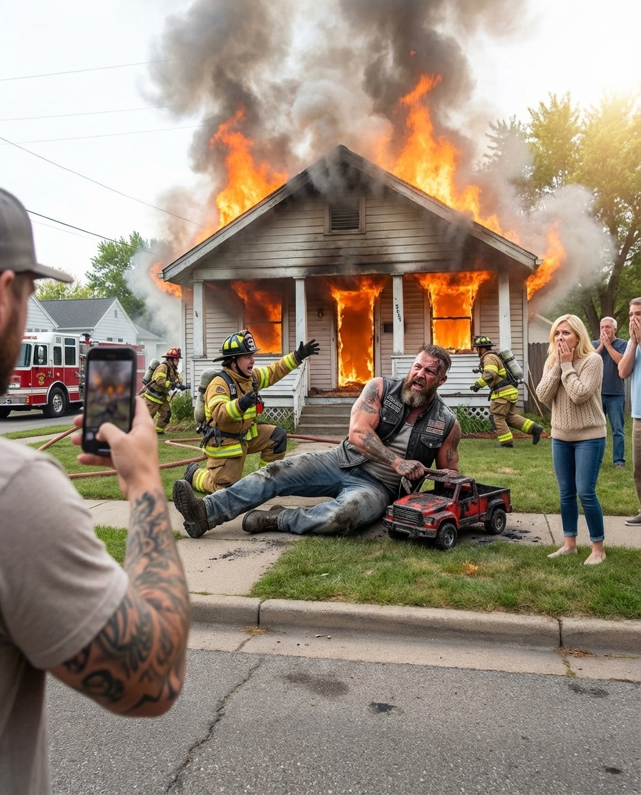 The Tattooed Biker Lying in Front of a Burning House — When Firefighters Forced the Door Open, They Finally Understood Who He Was Protecting