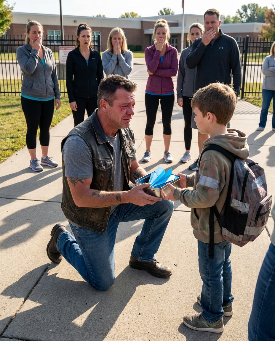 Every afternoon at exactly 3:15, a heavily tattooed biker dropped to one knee on the cold concrete outside a quiet suburban school, clutching a crumpled blue paper airplane like it was something sacred—while dozens of parents pretended not to stare and wondered what was wrong with him.