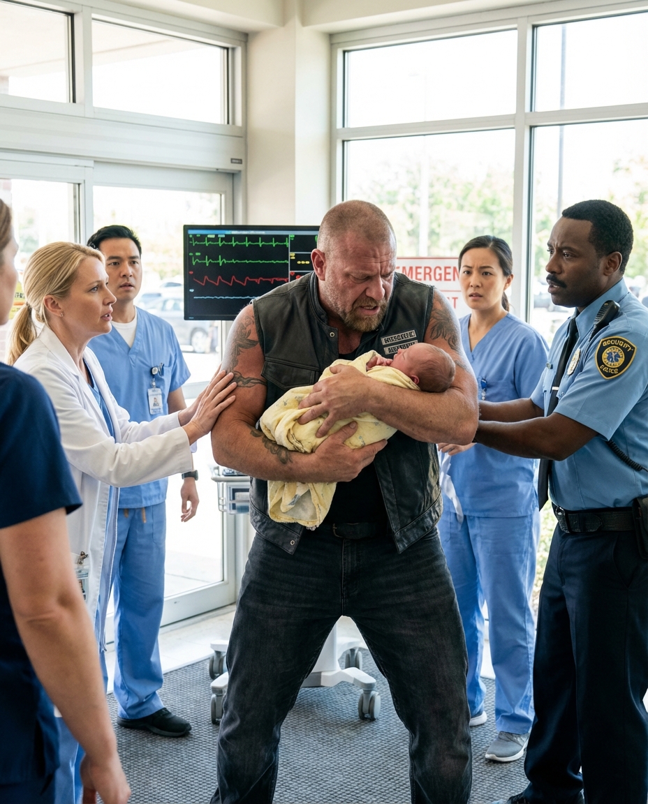 A heavily tattooed biker—broad shoulders, leather vest soaked with rain, knuckles scraped raw—stood in the middle of the emergency room, clutching a tiny newborn wrapped in a faded yellow blanket.