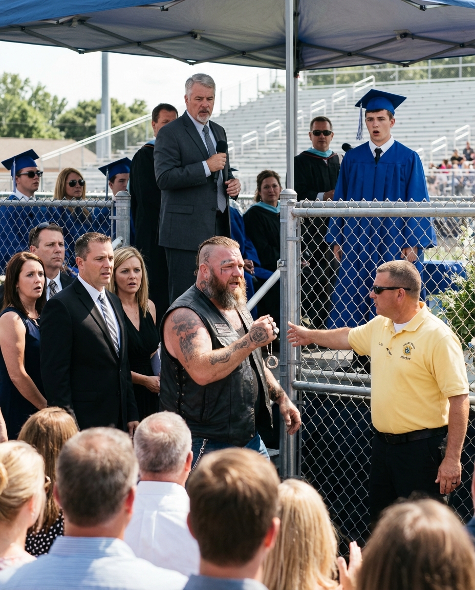 The biker with tattoos covering half his face stood quietly in the back row of a suburban American graduation ceremony—until a teacher walked straight toward him and demanded he leave, and suddenly the entire room turned to stare.