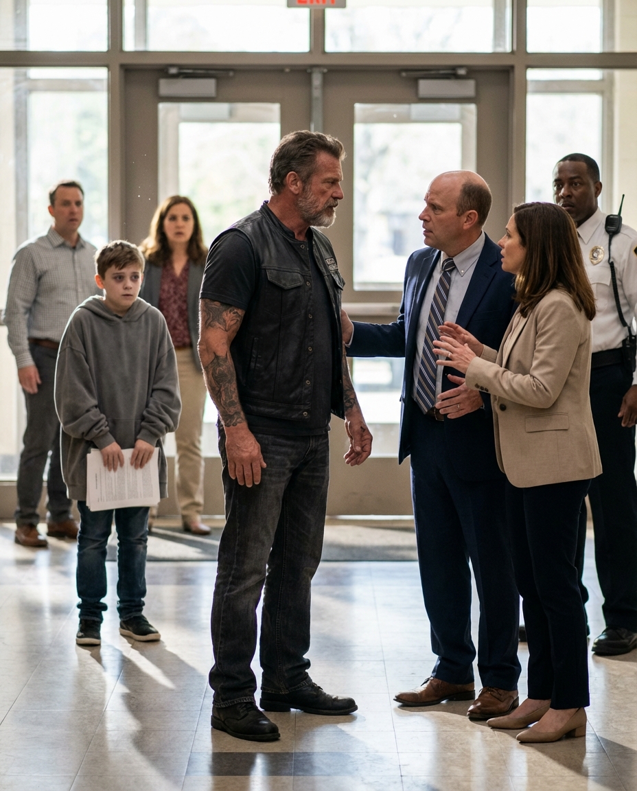 A security officer appeared near the entrance. The secretary reached for the phone. Whispers traveled fast: “Call district.” “Is he threatening someone?” “Is that one of those gangs?”