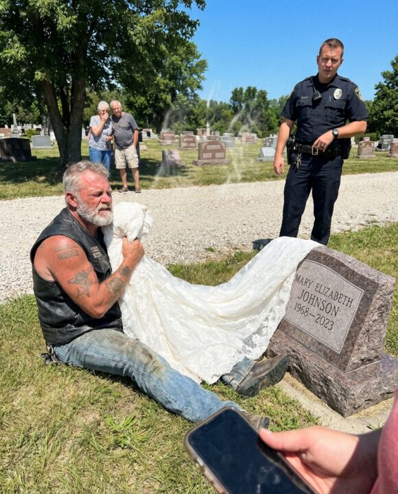 He sat on the grass in front of a polished granite marker, boots planted wide, back slightly hunched, arms wrapped tightly around a wedding gown. Not folded. Not draped.