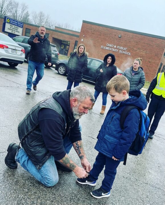 They Saw a Biker Quietly Kneel to Tie a Boy’s Shoes Before School — What He Whispered Next Left Everyone Speechless