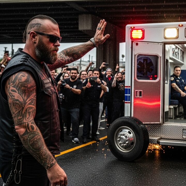 The biker stood and planted himself between the ambulance and the crowd—silent, unmoving, infuriatingly calm.