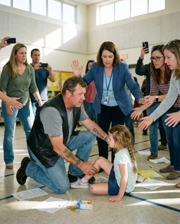 The biker helped Lily sit upright. His movements were careful, economical, like someone trained to conserve energy and avoid panic. He checked her elbow. Her knee.