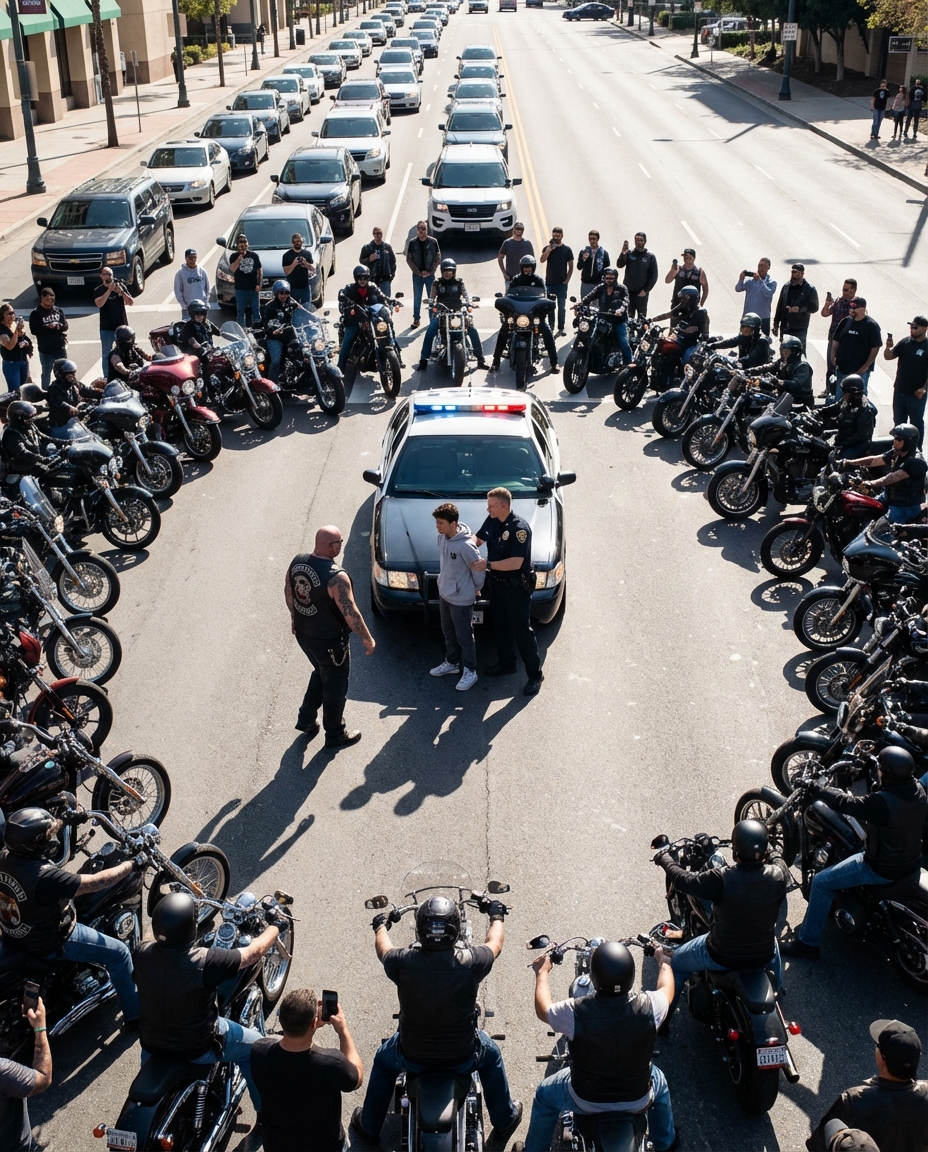 Thirty leather-clad bikers forming a silent circle around a lone police cruiser in the middle of rush-hour traffic should have meant danger—but what unfolded inside that circle made witnesses question everything they thought they saw.