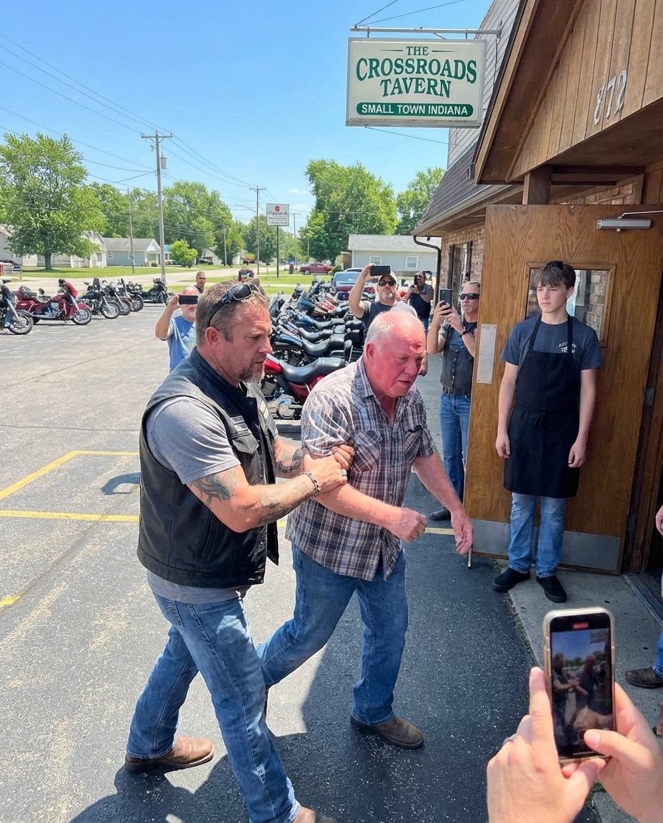 The biker reached across the bar—not violently, not swinging—but firmly enough to grip Jake’s forearm and guide him toward the exit.