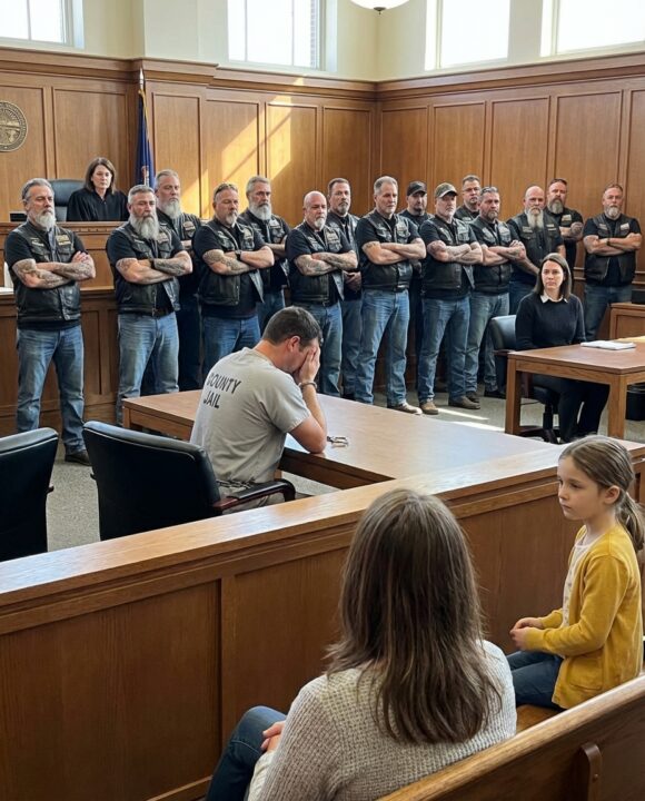 When the handcuffed father began to cry in open court and a line of leather-clad bikers stood behind him, the entire courtroom thought they were witnessing intimidation—until one sentence changed everything.