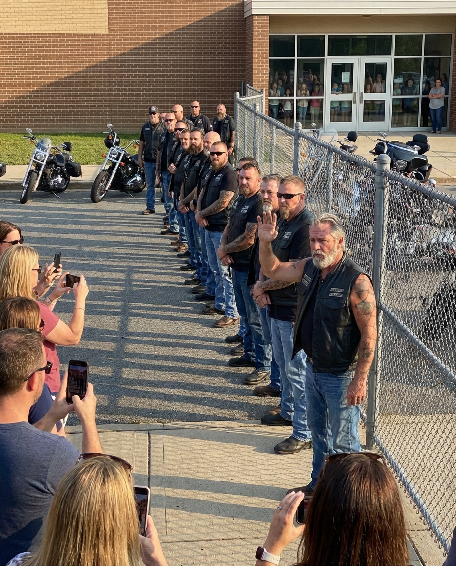 Within seconds, a line of black motorcycles rolled toward the school entrance like distant thunder.