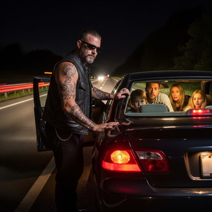 The road was swallowed by darkness, broken only by passing headlights and the distant hum of engines. On the shoulder sat a family sedan, tilted slightly, its hazard lights blinking like a weak distress signal no one wanted to answer.